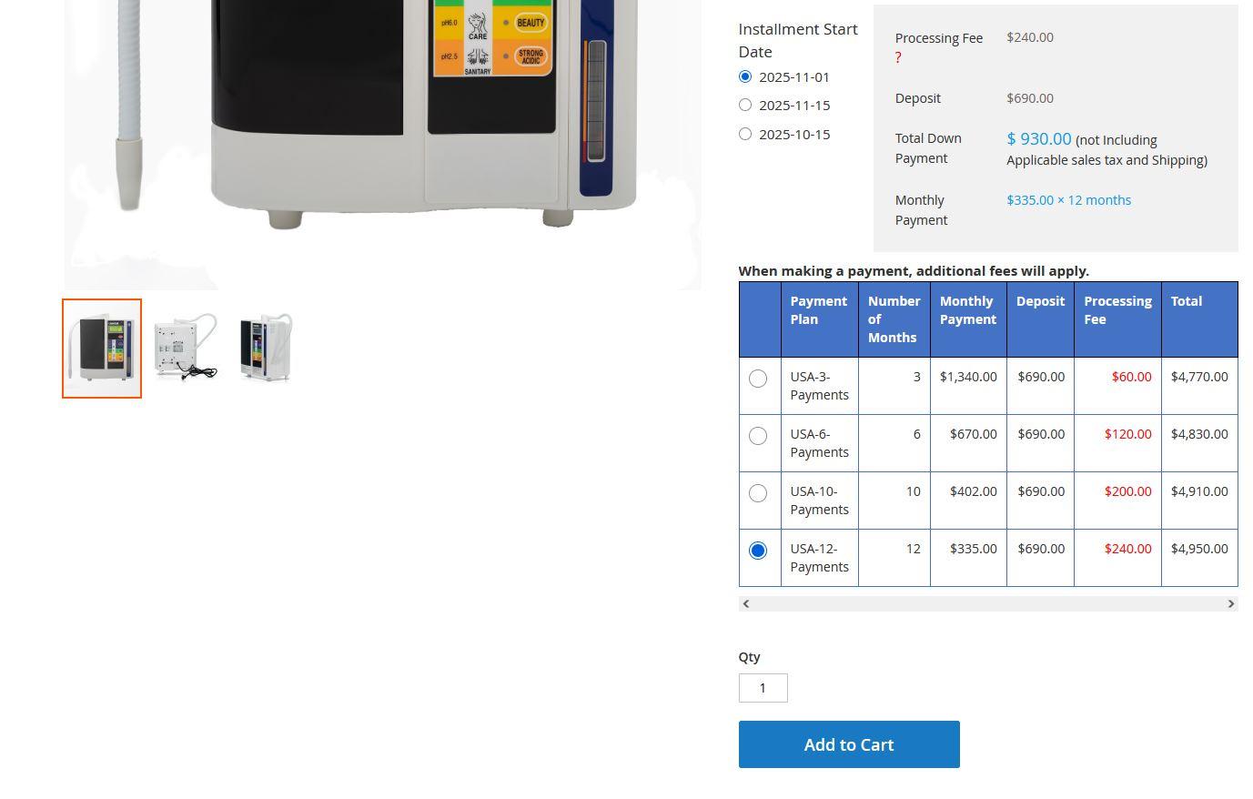 The "processing fee" is a $20-a-month fee that is included in your down payment amount. And it is refunded back to you for each month early you pay the machine off. For example, if you pay it off 5 months early, you will get back $100 of that "processing fee". If you pay for your Kangen Water machine using the 1st or 2nd payment options shown above, there is no "processing fee."