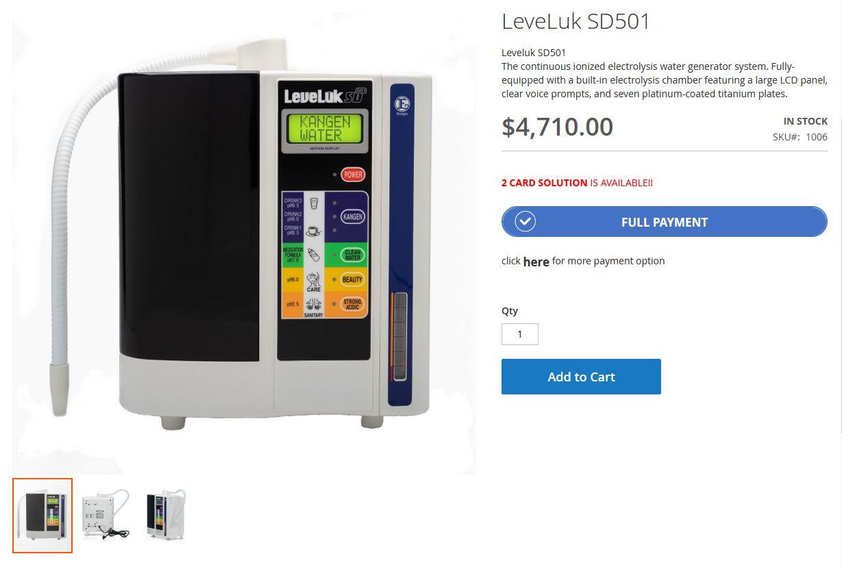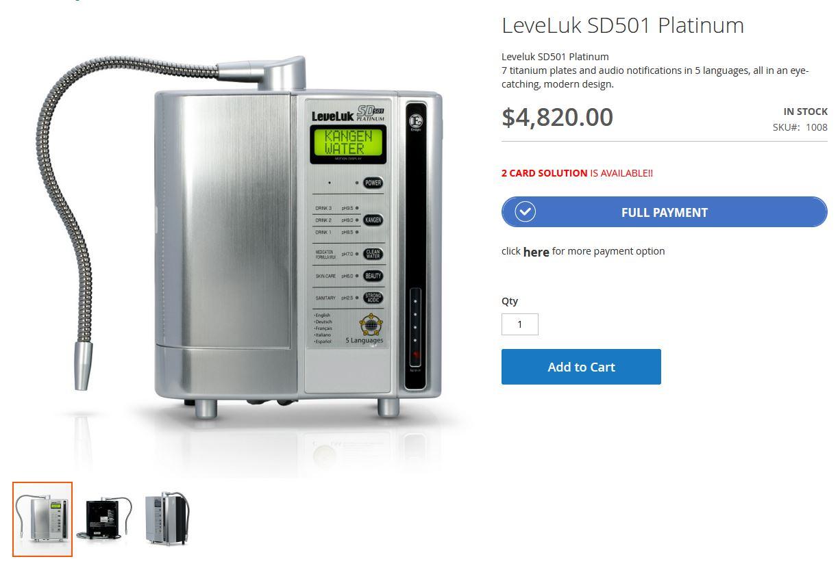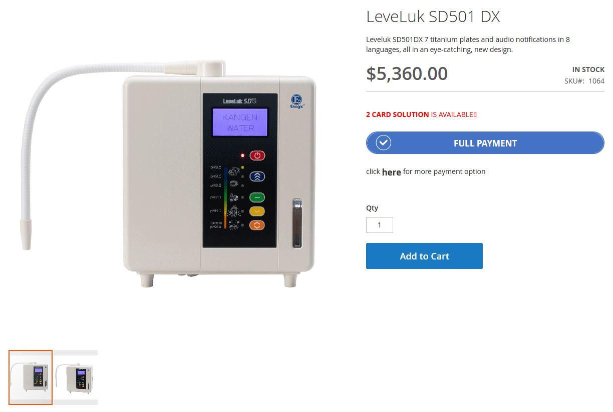 The SD501 is currently USD $4710. The stainless steel appearance model, the SD501 Platinum is $4820. The SD501 DX (Deluxe) is $5360.(Exact same strength and quality of water as the other SD501 models, with a different look (all white) and speaks in different languages and has worldwide multi-voltage power supply like the K8 has.
